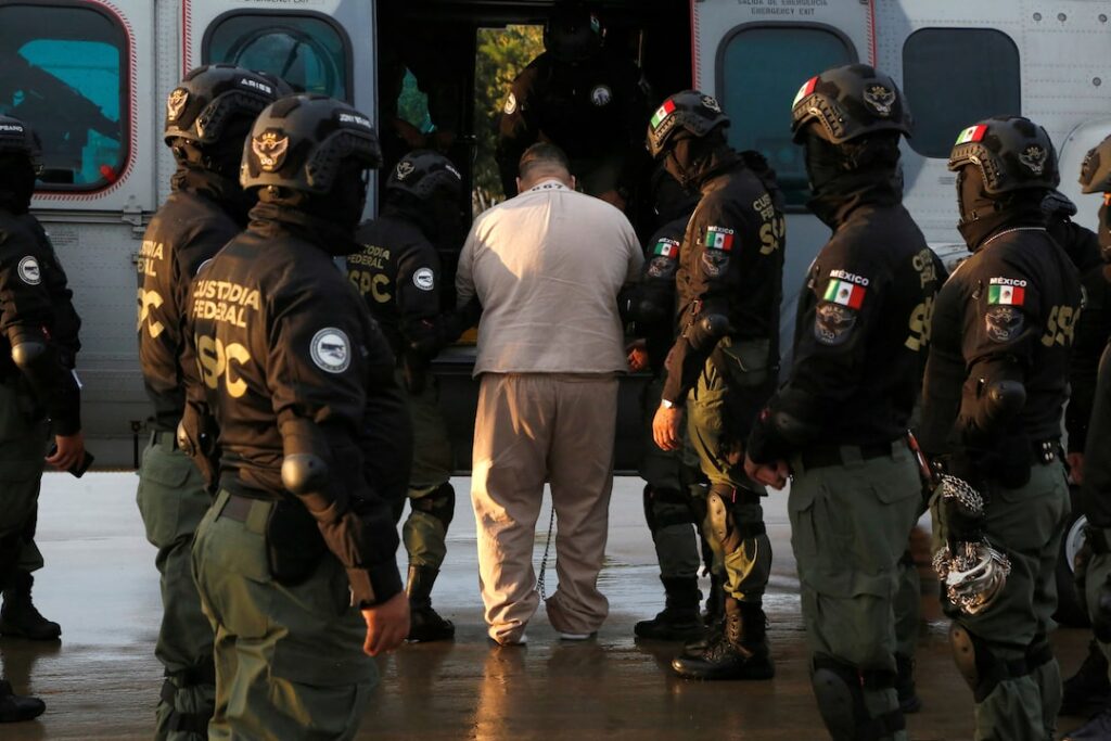 मेक्सिको के संघीय बलों के सदस्य, अमेरिका में ड्रग तस्करी समूहों से संबंध रखने के आरोप में वांछित एक कैदी को अल्टीप्लानो उच्च सुरक्षा जेल में ले जाते हुए, उसे टोलुका अंतर्राष्ट्रीय हवाई अड्डे पर स्थानांतरित करने से पहले, अमेरिकी राष्ट्रपति डोनाल्ड ट्रम्प द्वारा ड्रग कार्टेल को खत्म करने के दबाव के बीच, अल्मोलोया डे […]