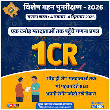 मतदाता विशिष्ट गणना प्रपत्रों (ईएफ) के मुद्रण और वितरण की स्थिति राज्य/केंद्र शासित प्रदेश बीएलओ/बीएलए की संख्या मुद्रित ईएफएस वितरित ईएफ नाम 27 अक्टूबर 2025 तक मतदाता बीएलओ* बीएलए** संख्या % संख्या % 1. अंडमान और निकोबार 3,10,404 411 683 3,10,404 100% 2,78,788 89.81% 2. छत्तीसगढ़ 2,12,30,737 24,371 38,846 2,12,30,737 100% 1,66,47,685 78.41% 3. गोवा 11,85,034 1,725 […]