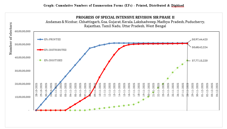 विशेष गहन पुनरीक्षण (एसआईआर) चरण II गणना चरण: 4 नवंबर, 2025 से 4 दिसंबर, 2025 मतदाता विशिष्ट गणना प्रपत्रों (ईएफ) के वितरण और डिजिटलीकरण की स्थिति राज्य/केंद्र शासित प्रदेश बीएलओ/बीएलए की संख्या वितरित ईएफ ईएफ डिजिटल नाम 27 अक्टूबर 2025 तक मतदाता बीएलओ** बीएलए*** संख्या प्रतिशत संख्या प्रतिशत 1. अंडमान और निकोबार 3,10,404 411 683 3,10,367 99.99 2,36,770 76.28 2. छत्तीसगढ़ 2,12,30,737 24,371 38,846 2,11,26,508 99.51 1,65,17,666 77.80 […]