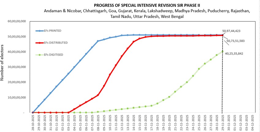 मतदाता विशिष्ट गणना प्रपत्र (ईएफ): वितरण की स्थिति और डिजिटलीकरण की स्थिति अवरोही क्रम में राज्य/केंद्र शासित प्रदेश बीएलओ/बीएलए की संख्या वितरित ईएफ ईएफ डिजिटल नाम निर्वाचकों की स्थिति 27 अक्टूबर 2025 बीएलओ** बीएलए*** संख्या % संख्या % 1. लक्षद्वीप 57,813 55 133 57,813 100.00% 57,813 100.00% 2. गोवा 11,85,034 1,725 2,734 11,85,031 100.00% 11,27,747 95.17% 3. राजस्थान* 5,46,56,215 52,222 […]