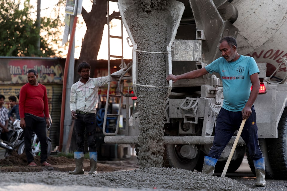 3 मार्च, 2026 को नई दिल्ली, भारत में सड़क निर्माण के दौरान मजदूर सीमेंट और बजरी का मिश्रण उतार रहे हैं।
