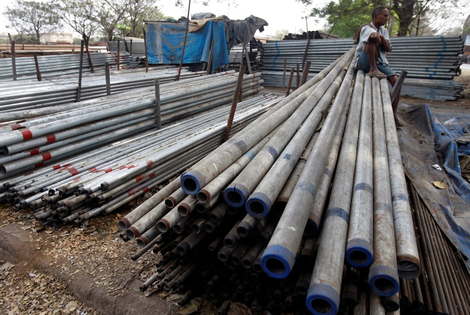 10 फ़रवरी, 2010 को मुंबई के एक स्टील बाज़ार में एक मज़दूर स्टील के पाइप पर आराम करता हुआ। रॉयटर्स