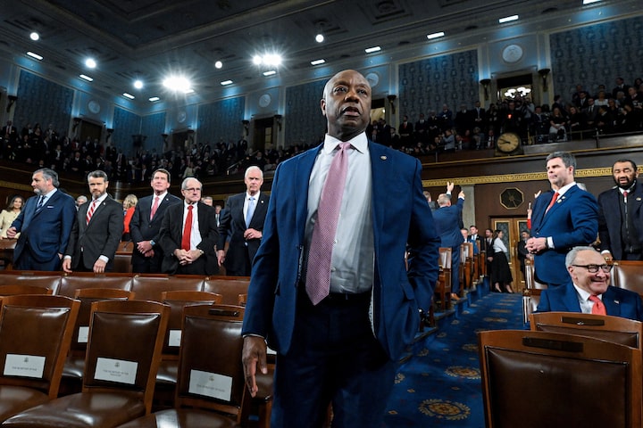 दक्षिण कैरोलिना के रिपब्लिकन सीनेटर टिम स्कॉट, मंगलवार, 24 फरवरी, 2026 को वाशिंगटन, डीसी में अमेरिकी कैपिटल भवन के सदन कक्ष में अमेरिकी राष्ट्रपति डोनाल्ड जे. ट्रम्प द्वारा अपने दूसरे कार्यकाल के पहले स्टेट ऑफ द यूनियन भाषण देने से पहले सदन कक्ष में खड़े हैं।